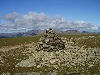 The summit of Brim Fell bears a fine slate cairn on grass, with a second big cairn to the north east. The views are extensive although the long whale-backed ridge tends to limit the foreground.[6]