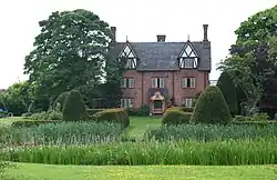Radbrook Cottage on Long Lane in Radmore Green is a timber-framed black-and-white cottage which dates from 1617.[22] A black-and-white cottage on Kidderton Lane dates originally from the late 17th century.[23] Both cottages are listed at grade II. Brindley Lea Hall (SJ590535) is a brown-brick farmhouse which was built around 1860 as part of the Tollemache estate; it is also grade II listed.[24] The present house was built on the site of a moated house, believed to be the seat of the Allen family during the 17th century.[19] The former Wesleyan Methodist chapel in Brindley village dates from 1873.[1]