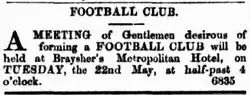 The Brisbane Football Club was formed at a meeting on 22 May 1866: the Brisbane Courier reported that "A meeting of gentlemen favorable to the formation of a Football Club in Brisbane was held on Tuesday, at Braysher's Metropolitan Hotel [formerly in Edward Street near Mary Street] ... a committee was appointed to prepare a code of rules ... The prospects of the club must be certainly very encouraging to the promoters, as already more than twenty gentlemen have joined, and a large number of others have signified their wish to do so."[4]