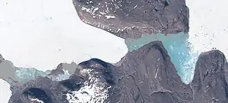 Britannia Sø is a large lake at the northern end of Queen Louise Land, to the west of the vast Storstrømmen glacier.[4] The lake is located at the terminus of the Britannia Glacier that flows from the north. The central section of the glacier terminus stays frozen all year round, dividing the unfrozen area of Britannia Lake in two. The surface of the eastern and western ends is usually free of ice in July and August every year. The Strandelv River flows from the south into the bay of the eastern wing of the lake and the Admiralty Glacier flows from the southwest into the western end.[7]