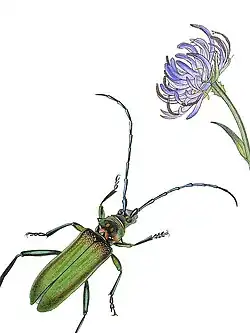 It was a masterpiece of the engraver's and colourist's art, described by Pierre André Latreille (1762–1833) (but wrongly attributed to the eminent French naturalist Georges Cuvier) as the "paragon of perfection". Close examination of a proof set of plates (see below) reveals an obsessive attention to detail. The shading of the foliage is typically achieved by multiple, finely engraved lines spaced at intervals of five or more to the millimetre. The fronds (olfactory receptors) of many moth antennae are individually coloured – as in plate 674 (left). Several beetles and flies have body and limb highlights picked out in minute dots and lines of powdered gold. Thoracic and abdominal hairs are mostly painted individually. Where transparent wings are shown extended the colouring involved the precise application of multiple colour washes overlaid by a satin finish, gum arabic glaze to reproduce the visual effect of iridescence.