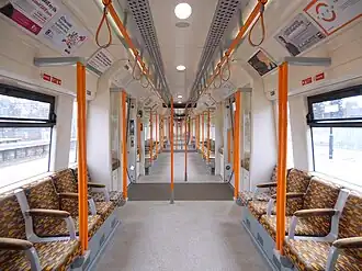 The interior of the train was designed to maximise passenger capacity. Traditional seating was eliminated and longitudinal seats adopted instead, along with wide areas around the doors to speed the entrance and exit of passengers.[8] Furthermore, a significant portion of each car is intended for use by standing passengers, and thus have grabrails and other holding points for such passengers to steady themselves, broadly similar to a London Underground tube train. The trains lack toilets, as the whole NLL line takes a little more than one hour to traverse from end to end.[8][4] In conjunction with the base internal configuration, the cars were outfitted with numerous modern amenities aimed at improving passenger comfort, such as air conditioning, real-time passenger information systems, wheelchair accessibility (including the facilitating of level access), and different seat moquette colours to highlight priority seating.[8][11]