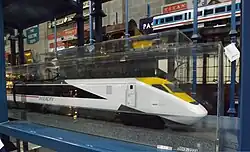 A life-size mock-up of the Class 93 is on display at the Midland Railway – Butterley in Swanwick and a 1:20 scale model is displayed in the Warehouse in the National Railway Museum, York.[2] Prior to the announcement of Agility Trains as the preferred bidder for the Intercity Express Programme a number of commentators called for the InterCity 250 / Class 93 idea to be revived as the basis for replacement rolling stock on the East Coast Main Line. Even though the Class 93s were never built, the traction characteristics of the locomotives were used in Railtrack WCML feasibility studies to determine the electrification requirements for an upgraded line.[3] Virgin Trains (the operators of the InterCity West Coast franchise after privatisation) consequently ordered new rolling stock for the route, albeit EMUs rather than loco-hauled stock.