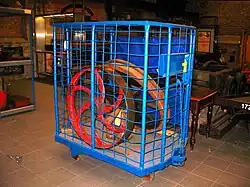 BRUTEs were a wheeled platform, generally with mesh around three sides of the body, the fourth side being open with canvas (or later plastic) straps for restraint of the load. The front included a panel for notes to be chalked to help sort traffic. A few BRUTEs had just the front, for carrying bulky loads too big for the cage, or two hinged ramps (no sides) to load or unload BRUTEs into railway vans. Each BRUTE had two fixed wheels at the rear and two swivelling caster wheels at the front, with polyurethane tyres and taper bearings.[1] Coupling were at front and rear, the front being a pin, the rear a hinged loop on a sprung shaft. A lever on the front operated brakes on the rear wheels and lifted the coupling pin.