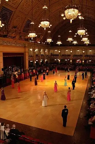 The championships for adults take place as part of the Blackpool Sequence Dance Festival and have been running since 1949.[1] They are held in the Empress Ballroom at the Winter Gardens in Blackpool. Dancers compete in up to five sequence dances determined by the organiser each year for the titles. The British Championship is seen as the highlight of the year, not only because it is "one of the country's most prestigious titles",[2] but also due to the grandeur of the location.