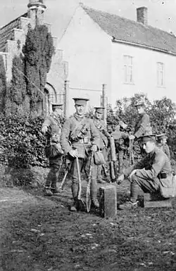The British yeomanry during the First World War were part of the British Army reserve Territorial Force. Initially, in 1914, there were fifty-seven regiments and fourteen mounted brigades. Soon after the declaration of war, second and third line regiments were formed. However, the third line regiments were soon absorbed into the Cavalry Reserve Regiments, to supply replacements for the cavalry and yeomanry. Other horsed regiments in the British Army, during the war, were the regular cavalry regiments and the three regiments belonging to the special reserve: the North Irish Horse, the South Irish Horse and the King Edward's Horse.[1] The senior yeomanry regiments could trace their origins back over 100 years; the oldest regiment, the Royal Wiltshire Yeomanry, had been formed in 1794. The most junior regiment, the Welsh Horse, had only been formed on 18 August 1914, after the start of the war.[2]