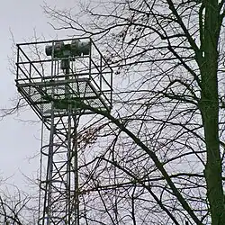 The Broadmoor Sirens were installed in 1952 after John Straffen escaped from Broadmoor and murdered a child in Farley Hill, Berkshire. They are similar to air-raid sirens but employ shutters to produce an alternating "high – low" warning tone.[2] More sirens were added in the 1960s[3] after discussions in the House of Commons raised the issue that the sirens' two-mile (3.2 km) radius was insufficient for nearby towns such as Camberley and Wokingham.[4]