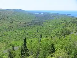 Brockway Mountain is a 1,320-foot-tall (400 m) volcanic landform on the Keweenaw Peninsula of Michigan about five miles (8.0 km) west of Copper Harbor.[11] The top of the mountain is 720 feet (219 m) above the level of Lake Superior.[12] The peak was named for Daniel D. Brockway, local pioneer settler, postmaster and state road commissioner. Brockway moved to Copper Harbor in 1846 at the beginning of the area's copper boom. He built the first permanent structure in the community, a hostelry named The Brockway House, which was used by the miners and scientists in the area. By the time of his death on May 9, 1899, the ridge west of town had been named in his honor.[13]