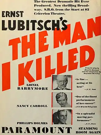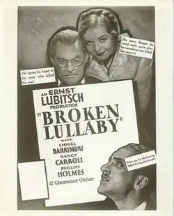 Broken Lullaby (a.k.a. The Man I Killed) is a 1932 American pre-Code drama film directed by Ernst Lubitsch and released by Paramount Pictures. The screenplay by Samson Raphaelson and Ernest Vajda is based on the 1930 play L'homme que j'ai tué by Maurice Rostand and its 1931 English-language adaptation, The Man I Killed, by Reginald Berkeley.