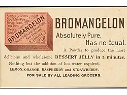 Bromangelon was a gelatin dessert popular in the late 19th century and early 20th century. It was invented around 1895 by Leo Hirschfield, who would later invent the Tootsie Roll. Bromangelon is regarded as the first commercially successful gelatin dessert powder,[1] having been mass-marketed several years before Jell-O, which would eventually drive Bromangelon off the market.