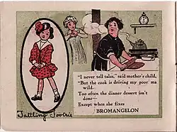 Some advertisements for Bromangelon featured a character named "Tattling Tootsie", whom candy scholar Samira Kawash describes as "a cute little girl whose mischief seems only tangentially connected to the joys of gelatin."[8] Inventor Leo Hirschfield's daughter Clara's nickname was "Tootsie" — the namesake for his later invention, Tootsie Rolls. It is thought that Clara inspired Tattling Tootsie as well.[8]