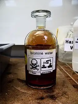 Bromine water is an oxidizing, intense brown mixture containing diatomic bromine (Br2) dissolved in water (H2O).[1] It is often used as a reactive in chemical assays of recognition for substances which react with bromine in an aqueous environment with the halogenation mechanism, mainly unsaturated carbon compounds (carbon compounds with 1 or more double or triple bond(s)). The most common compounds that react well with bromine water are phenols, alkenes, enols, the acetyl group, aniline, and glucose. In addition, bromine water is commonly used to test for the presence of an alkene which contains a double covalent bond, reacting with the bromine water, changing its color from an intense yellow to a colorless solution. Bromine water is also commonly used to check for the presence of an aldehyde group in compounds. In this reaction, the color of bromine water is changed to yellow from colorless (oxidation process).