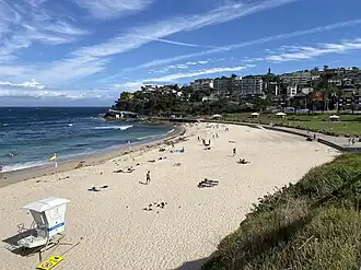 The size of the sandy area of the beach is far less than it was prior to 1914 when a promenade and sea wall were constructed.[1] A functional storm water drain emptying near to the bogey hole was built in 1918. During heavy wave conditions in 1961 six children swimming in the bogey hole were washed back into the pipes. All six were safely rescued by Waverley Council Life Guards and Bronte lifesavers who had to crawl up into the pipes following the two branches. On the Northern end near to a stairway there is a naturally formed, large sandstone cave. This shady sheltered cave may have been used by the local indigenous people.[1]