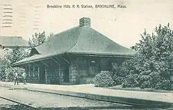The station agent was removed in May 1949, but the station building remained in use as shelter for passengers.[6] The final trains on the line ran on May 31, 1958. The line was converted to light rail by the M.T.A. and Brookline Hills reopened on July 4, 1959, along with the rest of the D branch.[1] The 1892 depot is no longer extant.