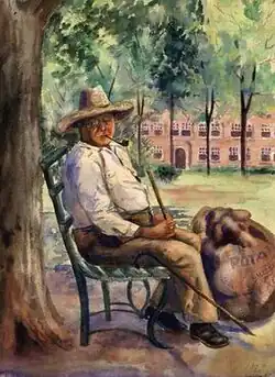 This painting depicts an African American man, Brother Brown, sitting on a park bench, smoking a pipe, under a tree. He has a cane on at his side, propped up against the bench. He wears a hat, white button-up shirt, suspenders, brown trousers and dark brown shoes. A large sack sits on the ground by him. "Potatoes" is written on the bag. The man looks at the towards the viewer.[2]