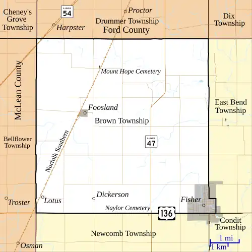 The city of Fisher lies in the southeast corner of the township; portions of the town extend into neighboring townships, but the majority is in Brown Township. The small town of Foosland is in the western part of the township along the route of the Norfolk Southern railroad.