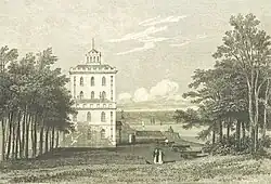 The castle was sold to a Mr Chamberlayne and then onto Sir Gerard Sturt in 1762 and Gerard's cousin, Sir Humphrey Sturt, in 1765.[28] Humphrey extended the castle around its 16th century core to form a Palladian styled, four-storey tower with battlements, with new wings stretching away on three sides.[14] He also built a walled courtyard with hot houses beside the castle, and landscaped the island with two lakes and a large number of fir trees at a cost of £50,000.[29] His son, Charles Sturt, made the castle his primary home, although he was often living elsewhere as a result of his involvement in the Napoleonic Wars.[30]