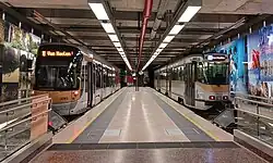 The premetro tunnels have been built to allow for eventual upgrade to heavy metro, so most of the platform is high, and is connected to the street (at least in the upward direction) by escalator. At some stations, lifts have been installed, but there is a cutout section taking the level down to one foot above ground to board the trams. The three steps this entails make life difficult for passengers with baby buggies or suitcases, even though the new low-floor trams are accessible to wheelchair users.[1]