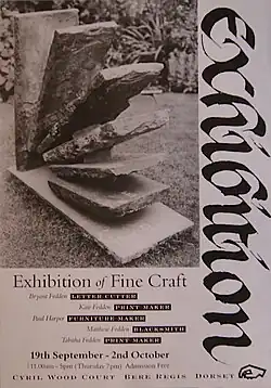 Bryant Fedden then moved to Littledean, Forest of Dean, Gloucestershire and together with wife Kate Fedden (glass engraving), his son Matthew Fedden (artist-blacksmith) and his son-in-law Paul Harper (furniture maker) set up a multi-functioning workshop.[17] Bryant Fedden's notable works from this time include a viewing platform plaque of a short poem by Robin Munro carved in stained oak for the National Garden Festival in Gateshead in 1990; the carved grave stone for his friend Li Yuan-Chia, the renowned Chinese artist, poet and curator in 1994 and the public art Memorial to Littledean Dairymen in Littledean, Gloucestershire in 2000.[18][19][20][21]