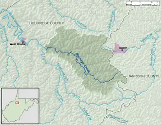 Buckeye Creek is a tributary of Middle Island Creek, 12.7 miles (20.4 km) long,[3] in north-central West Virginia in the United States. Via Middle Island Creek and the Ohio River, it is part of the watershed of the Mississippi River, draining an area of 39.1 square miles (101 km2)[4] in a rural region on the unglaciated portion of the Allegheny Plateau.