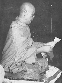 Bhaddanta Lokaratthi (Ven. Boun-Than Bouppharath Dhammañāṇo), official title Somdet Phra ฺBuddhajinros Sakalamahāsanghapāmokkha, Sangharājā of Laos reads a speech at the opening of the Laos-Cambodia session of the Buddhist Council (Chaṭṭa Sangāyanā), 1955-04-28.