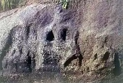 Kalkata-iv is situated above half a km east of Kalkata-iii on the right side of the road leading to Banjot village. The rock reveals fifteen (thirteen human & two animal) figures all are in situ, but covered by trees and wild bushes. Most of the artistic details are faded and defaced. The extant remains shows two animals and thirteen human figures. Four are dhyani Buddhas of different sizes and five are Bodhisattvas in lalitasana in pensive attitudes. Two Bodhisattvas are on simhasana. Four among them are the states of standing figures in different attributes. All the reliefs are defaced and covered with a thick layer of white patina deposited by a water channel running above the rock that has obscured most of the details.