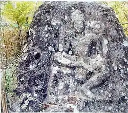 Kalkata-iii is square block of stone shows reliefs on its three sides. It lies just above Kalkata-ii and not in situ. Wild bushes and shrubs have thickly covered the rock all around. According to the local people it depicts on its three sides three different statues. Presently only two sides where carvings are visible revealing dhyani Buddha on the top and undefined Bodhisattva in lilatasana in pensive attitude on the west. His right hand rests on the right thigh, while the left one on the left thigh holding lotus stem. The carvings are in bad state of ation.
