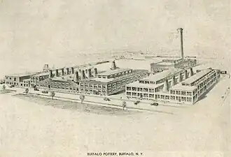 Buffalo Pottery was located on 8.5 acres at Seneca Street and Hayes Place in Buffalo, New York. At the time of its completion in 1903, the 80,000 square foot plant was the largest fireproof pottery in the world; and it was also the only pottery in the world completely operated by electricity.[3]