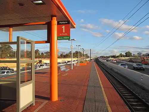Bus transfers are available on the concourse level. The bus station is on a bridge structure extending over the Kwinana Freeway carriageways and train station. Traffic signals at both ends of the bridge have been modified to include a bus phase.