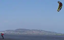 A kite enthusiast on Bull Island with Howth and the Sutton Martello tower in the background.