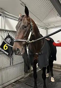 Bulldog Hanover (foaled May 21, 2018) is a retired champion Canadian Standardbred racehorse who is known for becoming the first harness horse to complete a mile in under 1:46.[1] He was also the first horse to be unanimously selected as the Dan Patch Horse of the Year.[2] He has been likened to legends Somebeachsomewhere and Niatross[3] and is considered to be among the best harness horses of all time.[3][4][5] Bulldog Hanover was inducted into the Canadian Horse Racing Hall of Fame in 2023.