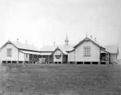 At the turn of the century, two playsheds were constructed to the north of the teaching building: a 10-post playshed in 1900 and a 12-post playshed for boys in 1907. Both were constructed of exposed timber framing and the 1907 playshed had a metal sheet roof with ventilated ridge cap.[15] The Queensland education system recognised the importance of play in the school curriculum and, as well as classrooms, they provided plans for playsheds, free-standing shelters that provided covered play space and were often used for unofficial teaching space when needed. They were timber-framed structures, generally open on all sides although were sometimes partially enclosed with timber boards or corrugated galvanised iron sheets.[16] The hipped (or less frequently, gabled) roofs were clad with timber shingles or corrugated iron and they had an earth or decomposed granite floor. Fixed timber seating ran between the perimeter posts. Playsheds were a typical addition to state schools across Queensland between c. 1880s and the 1950s. They were built to standard designs that ranged in size relative to student numbers. School sites were typically cleared of all vegetation and the provision of all-weather outdoor space was needed. After c. 1909 school buildings were high-set, allowing students to play in the understorey and playsheds were not frequently constructed.[17][1]
