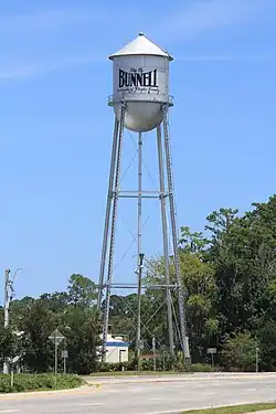 Towering over the City of Bunnell is the city's most visible and iconic landmark: the City of Bunnell elevated steel water tower. The water tower is located at 100 Utility Street, Bunnell, FL 32110. It was built in 1926 by Chicago Bridge & Iron Company as part of a new waterworks system for Bunnell that went into operation in December 1927 and has been providing water to residents and local businesses to this day. The water tower is 110 feet high and its elevated steel tank holds 75,000 gallons of water. The elevated steel water tank has a conical top, Horton hemispherical bottom and is supported by four steel columns (legs) and reinforced with steel cross braces. The east and west sides of the elevated tank have black painted signage that read “City of Bunnell, Crossroads of Flagler County”[2][3]