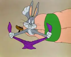 Bugs tries to wrestle Crusher, but Crusher is unfazed, toys with Bugs and, by turning Bugs' ears into a propeller, sends the rabbit flying into the crowd. When, on his return flight, Bugs is caught in Crusher's leg-scissors hold, he figures it's time to "employ a little stragety [sic]". Bugs rips his mask apart, causing Crusher to believe his trunks have torn. As the hulking wrestler squirms, embarrassed, in the ring, Bugs strolls back from off-screen wearing a sandwich board advertising his services as "Stychen Tyme," a tailor. Crusher tells him his problem and Bugs seemingly prepares to sew the trunks. Instead, he jabs a needle in Crusher's backside, resulting in him soaring, screaming, into the audience.