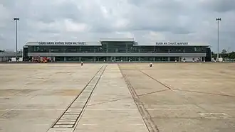 Buon Ma Thuot Airport (IATA: BMV, ICAO: VVBM) is a public airport in Vietnam. The airport is located near the provincial capital Buon Ma Thuot in Đắk Lắk province. Another name for this airport is Phung-Duc Airport.[2][3] It has one functional runway. A second incomplete runway (marked with a faded 27 R) is not in use. Two aprons are located on the south side of the airport with buildings that appeared to be used for aircraft storage. A barracks-like camp is located to the north side of the airport. This airport handled 860,000 passengers in 2016.[1]