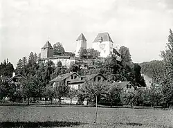 During the High Middle Ages the land that would become Burgdorf was owned by the Kingdom of Burgundy and then after 1080 by the Dukes of Zähringen. Either the kings or the dukes built a castle on the left bank of the Emme river. Burgdorf is first mentioned in 1236 as in oppido Burchtorff, while Burgdorf Castle is mentioned in 1080 as castellum Bertoldi ducis.[5] The Zähringen dukes built a city (upper-west city section) around the castle in the last quarter of the 12th century. After the extinction of the Zähringen line, Burgdorf passed to the Counts of Kyburg. They expanded the city in 1278 with the upper-east section and between 1278 and 1300 absorbed the Holzbrunnen settlement which became the lower town. By 1300 the city had expanded to fill the town walls. Starting in 1323 there was a ban on construction within the walls, which marked the border of the city until 1800. Under the Kyburg or Neu-Kyburg Counts, Burgdorf Castle was the capital of the county, and the Counts were the mayors of Burgdorf town.