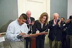Sen. Sanders overseeing the signing of the agreement between the CIW and Burger King
