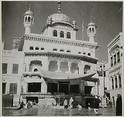 Giani Pardoman Singh, the next in line, was put under house arrest in the Burj Gianian, but later escaped to Ludhiana with his three brothers.[13] He returned after some time and won against the Dogras in court over the right to the Burj, though he was not able to recover the other three Bungas/Baradari around the complex due to the Anglo-Sikh Wars.[14] The influence of the Giani Samparda decreased during this time, as did the influence of Sikhism.[15] Giani Pardoman Singh and his brother Giani Lehna Singh had founded the Gurmukhi Akhbar, a newspaper, from the Burj Gianian.[15] After the death of Giani Pardoman Singh his son Giani Gurbaksh Singh, Barrister became the head, he was a proponent of Sikh education and worked on it during his period of heading the Samparda, till the Shiromani Gurdwara Parbandhak Committee disbanded the Giani Samparda in 1921.[15] Unofficially there still is a continuing titular lineage of Gianis, the next one was Giani Harinder Singh Roop, a famous Punjabi poet, and currently it is Giani Yadwinder Singh.[16] In 1988 there were four families of descendants of the Gianis who lived in the large Burj Gianian, but the Punjab Government had broken it down to build a Galliara (open walled space) around the Golden Temple for more control over it in the aftermath of Operation Black Thunder.[16] The historical site was not reconstructed, though an underground tunnel caused controversy when being unearthed, there have been protests over the historical nature and need to rebuild the Bungas, Baradaris and Burjs around the complex.[16]