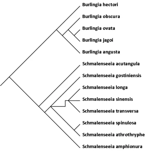 The relationship of the Burlingiidae with other Cambrian trilobites is uncertain. The only other group this early in trilobite evolution that has proparian sutures are the Eodiscina, but this suborder has many characters that make it very unlikely to be the ancestors of the burlingiids. Early scholars tentatively positioned the burlingiids in the Ptychopariida. The burlingiids have many more characters in common with the Redlichiina however, such as faintly imprinted glabellar furrows.[1]