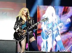 On the Re-Invention Tour, Madonna gave the song a rock interpretation, playing a black Gibson Les Paul electric guitar while dressed in military fatigues.[62] The performance included video projections of war and sexual imagery, which The New York Times compared to camcorder footage evocative of the prisons of Abu Ghraib.[63] The Daily Herald highlighted Madonna's ability to recast the song's "adolescent whine" into "adult certitude".[64] A similar arrangement was used on the Rebel Heart Tour, where Madonna performed with a Gibson Flying V guitar and wore a nun-inspired outfit.[65][66][67] Rappler described the rendition as confident and charismatic;[68] it was later included on the Rebel Heart Tour live album (2017), recorded during her Sydney performances.[69] The guitar-led version returned on the Celebration Tour, with Madonna dressed in a punk-style tailcoat designed by Dilara Fındıkoğlu.[70] The performance featured VHS-style visuals referencing her early days at CBGB, and The Guardian's Laura Snapes described the rendition as "brilliant".[71][72]