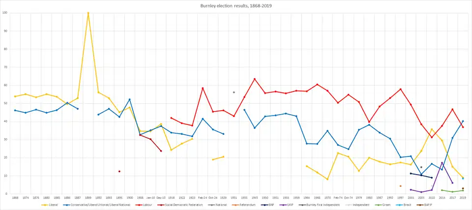 At the 2019 election, Antony Higginbotham won the seat for the Conservatives, thus becoming the first Conservative to represent Burnley in parliament for over 100 years.[4] The Conservative vote share increased by over 9% compared with the previous election, while the Labour vote share declined by about 10%.[5]