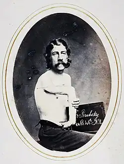 Photo from the book, Shooting Soldiers: Civil War Medical Photography by Dr. R.B. Bontecou. Written by Dr. Stanley B. Burns, published by Burns Archive Press. This photograph depicts G. Porubsky, Co B. 46th NY volunteer soldier displaying excision of the humerus. This photograph from Bontecou's teaching album shows Bontecou's operation of bone removal in the upper arm, which left the patient with a useless limb.