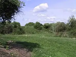 The archaeologist T. C. Lethbridge excavated the site in 1935.[8] At the time portions of stone walling survived but were later destroyed during testing of a fire hose.[9] The castle site was bought by the Burwell Parish Council in 1983.[10] The University of Exeter conducted a geophysical and topographical survey of the castle in the 2010s.[11] Today only the unfinished earthworks remain of the castle, which have scheduled monument status.[12]