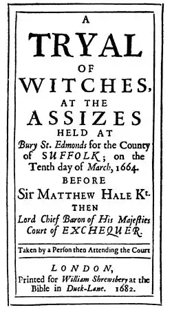 The trial began on 10 March 1662,[30] when two elderly widows, Rose Cullender and Amy Duny (or Deny or Denny), living in Lowestoft, were accused of witchcraft by their neighbours and faced 13 charges of the bewitching of several young children between the ages of a few months to 18 years old, resulting in one death.[31] They may have been aware of each other, inhabiting a small town,[32] but Cullender was from a property-owning family, whilst Denny was the widow of a labourer.[33] The charge of witchcraft was first brought against them by a Lowestoft merchant, Samuel Pacy,[34] who claimed that both women had separately called at his house to purchase herring, but had been upset to be turned away. Pacy accused the women of causing the afflictions of his two daughters, Elizabeth and Deborah, age eleven and nine respectively.[35] Pacy's sister Margaret also testified against the women.[36] They were tried at the Assize held in Bury St Edmunds under the auspices of the Witchcraft Act 1603,[37] by a well-respected judge Sir Matthew Hale, Lord Chief Baron of the Exchequer.[38]