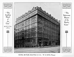 The Butler Hotel or Hotel Butler in Seattle, Washington, was one of Seattle's leading hotels in the late 19th and early 20th centuries.[1] It was located at the corner of Second Avenue and James Street, in what is now the Pioneer Square-Skid Road National Historic District.[2] During the Prohibition era, its Rose Room was repeatedly cited for flouting the laws against the consumption of alcoholic beverages. It closed in 1933;[1] the lower two floors survive as part of the Butler Garage.[2] The building itself is also known as the Butler Block, the name over the main entrance.