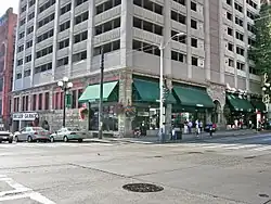 The Butler closed September 5, 1933. Its contents were auctioned January 15, 1934. All but the bottom two floors were then razed, and a multi-story parking lot erected where the hotel had stood.[1] Not everyone mourned: The Argus wrote "As a matter of fact the Butler was never a hotel to be especially proud of, although for years the food was considered the best in the city. It was constructed for an office building and later converted into a hotel. It was always a firetrap, and it is a very good thing that it is going the way it is instead of the way it might have gone."[15] Eventually the garage came to be owned by Sam Israel and, after his death, the Samis Foundation.[16] The parking garage underwent a major expansion in 2000.[17]