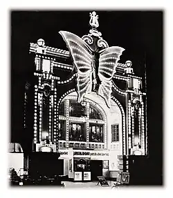 The theater's facade featured a terra-cotta butterfly with 1,000 light bulbs. The butterfly measured 27 ft (8.2 m) wide and at the center of the butterfly was a woman's body.[13][2] The facade had a total of 3,000 lightbulbs. Many of the decorative items including the butterfly were ordered pre-made. The butterfly was seen in a Decorators Supply Company catalog.[2] A Chicago company supplied decorative elements and terra-cotta items.[18]