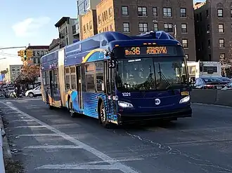 The Bx36 replaced 180th Street Crosstown Line streetcars on October 25, 1947. Its original south-eastern terminus was at Bruckner Boulevard-Zerega Avenue via Cross Bronx Expressway, running all times except nights until February 1984. On February 14, 1965, every other bus on the route was extended one mile to run to Pugsley Avenue and Story Avenue, instead of to the previous terminal of Chatterton Avenue and Zerega Avenue. These buses would turn off the regular route at Westchester Avenue and White Plains Road, running south on White Plains Road, Houghton Avenue, and Pugsley Avenue to the terminal, and via Story Avenue and White Plains Road before turning back onto Westchester Avenue for the return trip to Manhattan.[2] In November 1967, a full-time terminus was established at White Plains Road and Story Avenue, but later as part of the July 1974 service changes, it was extended to its current southeastern terminus. Eastbound buses were rerouted to use East 174th Street in both directions, with service on Cross Bronx Expressway being taken over by the Q44. On September 13, 1987, the Bx36 was extended from 181st Street and Broadway to the outside of the George Washington Bridge Bus Station at 179th Street and Broadway[3][4] and later on January 18, 1998, buses in both directions were rerouted to use Wadsworth Avenue instead of Broadway.[5] Westbound trips were streamlined onto White Plains Road, whereas they had previously deviated to Hugh Grant Circle/Parkchester station prior to September 2000. On September 8, 2009, the Bx36 Limited began service during rush hours, consisting of every other Bx36 during rush hours, and possibly saving up to eight minutes in each direction.[6] In 2017, the MTA released its Fast Forward Plan, aimed at speeding up mass transit services.[7] As part of it, a draft plan for the reorganization of Bronx bus routes was proposed in draft format in June 2019, with a final version published in October 2019.[8][9] The plan included rerouting service on Tremont Avenue and White Plains Road rather than 180th Street, Boston Road, and 174th Street, with the rerouted Bx40/Bx42 covering 180th Street and the rerouted Bx11 covering 174th Street. Changes would apply to both local and limited-stop variants and were proposed to be implemented by mid-2020.[10][11] Due to the COVID-19 pandemic in New York City, the changes were halted for over a year.[12][13][14] The modification took place on June 26, 2022.[15][16]