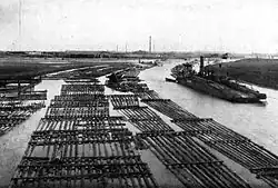 The establishment of the Bydgoszcz Timber Port was driven by the increasing timber rafting through the Bydgoszcz Canal to Germany from the mid-19th century.[1] Between 1818 and 1822, an average of 800 timber rafts passed through the Holy Trinity Lock II annually, but between 1868 and 1872, this number surged to 30,600, a 38-fold increase.[1]