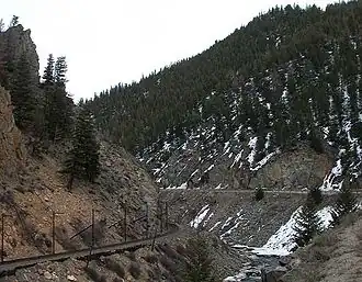 Byers Canyon is a short gorge on the upper Colorado River in Grand County, Colorado in the United States. The canyon is approximately 8 miles (13 km) long and is located in the headwaters region of the Colorado between Hot Sulphur Springs and Kremmling. U.S. Highway 40 passes through the canyon between Hot Sulphur Springs and Kremmling. The Union Pacific Railroad's Moffat Route also travels through the short canyon. The Byers Canyon Shooting Range is part of the Colorado Parks and Wildlife Hot Sulphur Springs State Wildlife Area within the canyon providing a winter foraging area for big game animals.[1]